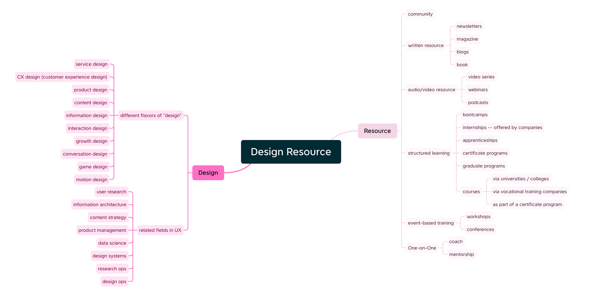 As information architects, designers, and taxonomists, we started to define what design was. It needed to be broad enough to include UX, product, content and research, but not too vague to include fashion design, built architecture, or environmental design. We might not include resources to learn about digital asset management systems, but we’d include things for learning about inclusive design, ethnographic research, and data science.